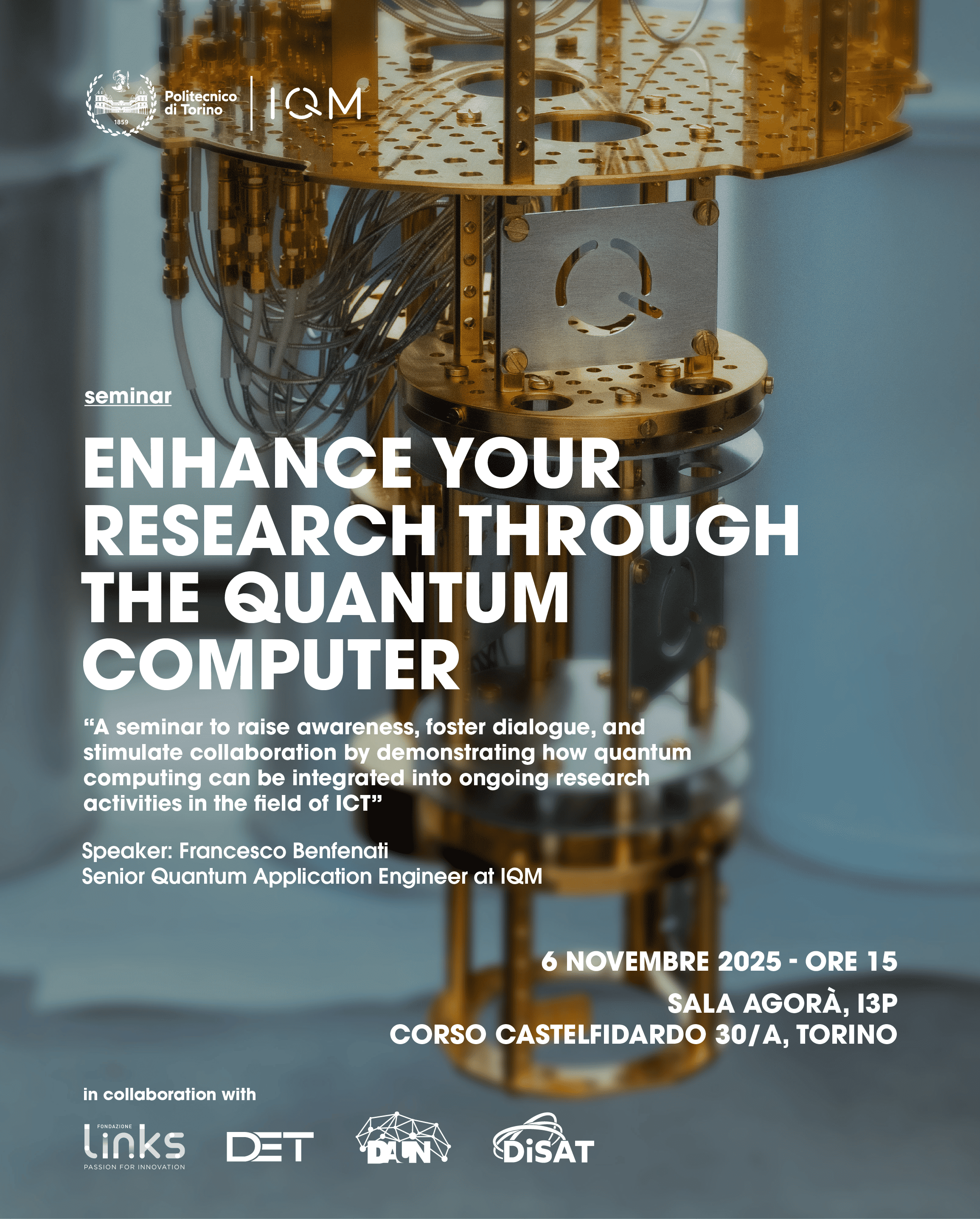 DiSAT, DET & DAUIN are glad to invite you at the seminar "Enhance your research through the Quantum Computer" organized ont he 6th of November at 3.00 p.m. in Sala Agorà - I3P.